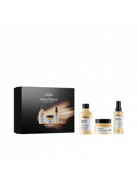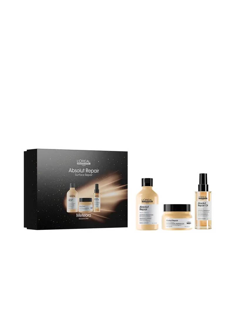 Incluye tres productos de la gama Absolut Repair, Serie Expert de L'Oréal Professionnel. Incluye champú de 300ml, mascarilla de 250ml y aceite de 90ml.