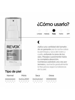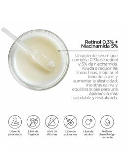 REVOX B77 JUST RETINOL 0.3% + NIACINAMIDE 5% es una potente fórmula diseñada pensando en las pieles sensibles y deshidratadas. Este sérum combina los beneficios antienvejecimiento del Retinol y las propiedades calmantes de la Niacinamida para ofrecer una solución integral para el cuidado de la piel. Se ha demostrado científicamente que el Retinol, en una concentración óptima del 0,3%, ayuda a combatir la formación de los signos prematuros del envejecimiento. Favorece la producción de Colágeno, lo que se traduce en una piel más firme y elástica y en una notable reducción de la aparición de arrugas y líneas de expresión. La Niacinamida (Vitamina B3) al 5% refuerza la función de barrera de la piel, ayudando a mantenerla suave, tersa y flexible al mejorar la retención de humedad. La Glicerina y la Betaína actúan conjuntamente para restaurar la barrera de hidratación de la piel, minimizando el riesgo de irritación, enrojecimiento y descamación.
