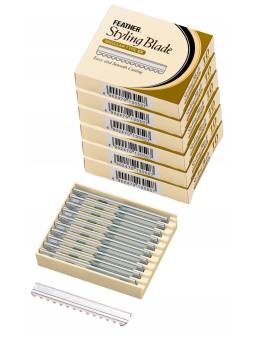 Caja con 5 estuches, cada uno con 10 hojas para utilizar con la maquinilla de afeitar de entresacar Feather.
