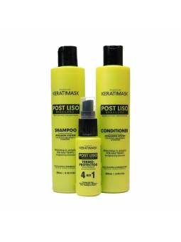 El kit perfecto para tratar tu cabello después de utilizar el alisado brasileño keratimask. Mantiene el cabello liso y cuidado y alarga la duración del alisado. Adecuado para todo tipo de cabellos y todo tipo de alisados. Sus productos no contienen sal, sulfatos ni parabenos. El kit contiene champú, acondicionador y protector térmico.