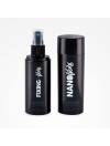 USO: A_LAVAR Y SECAR EL PELO. Asegúrese que su pelo está seco. B_APLICAR LA FIBRA. Aplique la fibra capilar en las zonas claras. Ajuste la cantidad de producto según su necesidad. Colocar el bote en unos 45º. Si la zona sin pelo es pequeña, poner el bote más cerca del área. Cuidado al sacudir el producto. C_AJUSTAR LA FIBRA CON LA YEMA DE LOS DEDOS. Acaricie suavemente con los dedos para dispersar el producto. D_APLICAR EL SPRAY PARA FIJAR LA FIBRA. Por último, aplique el spray para mantener la fijación. Mantenerlo bien cerrado y en un lugar seco mientras no se use.