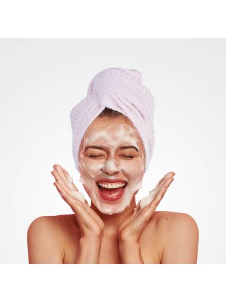 Toalla de microfibra que absorbe el exceso de humedad, reduce el encrespamiento y el tiempo de secado. La toalla se envuelve de forma sencilla como un turbante alrededor del cabello húmedo. Dispone de un botón y un elástico para que puedas engancharlo. Adecuada para todo tipo de cabello.