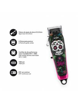 Cortadora profesional inalámbrica, para uso con o sin cable que alcanza 7200rpm y 12W de potencia, pesando tan sólo 290gr. Además, incluye 6 peines guía magnéticos resistentes (1.5mm,3mm,4.5mm,6mm,10mm,13mm). Su cuchilla fija tipo cóncava y la móvil standard de alto contenido de carbono y acero especial tipo 440C+SK5, que aportan dureza y excelente filo. También, incluye una cuchilla extra de zirconio tipo CRUNCH, con dientes alternados, permitiendo hacer texturizaciones durante el corte y crear una graduación suave. Gracias a este material, la temperatura de la hoja se reduce hasta un 70%. Su palanca de ajuste de altura con puntos pre-seteados (0,5/ 1 /1,5/ 2 /3 /3,5) permite cortar de de 0.5 a 3,5mm sin necesidad de adicionar peines de alzada. Batería de iones de litio de última generación, obteniendo 270´ de uso continuo con sólo 3hs de carga completa. Indicador LED de carga. Este set de 13 piezas incluye: Cortadora, 6 peines guía magnéticos (1,5mm, 3mm, 4,5mm, 6mm, 10mm, 13mm), cuchilla extra microdentada de cerámica, aceite lubricante, cepillo de limpieza, cobertor de cuchilla, cargador y base de carga.
