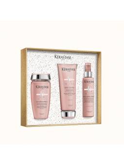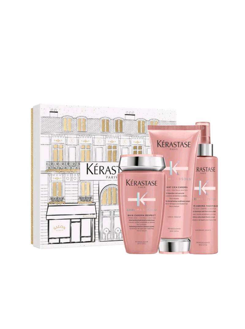 ¿Qué contiene el cofre? -Bain Chroma Respect, 250ml Champú protector del color con ácido láctico, para cabellos teñidos finos a medios. Proporciona suavidad inmediata y reduce el encrespamiento inducido por el color. -Fondant Cica Chroma, 200ml Acondicionador que penetra profundamente en la fibra, fortaleciendo las hebras y reduciendo la porosidad para un color más luminoso y duradero. -Chroma Thermal Serum, 150ml Sérum sin aclarado antiencrespamiento y antioxidante que protege el cabello del calor y lo deja con un aspecto saludable y brillante.