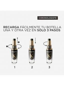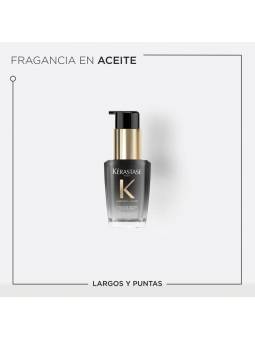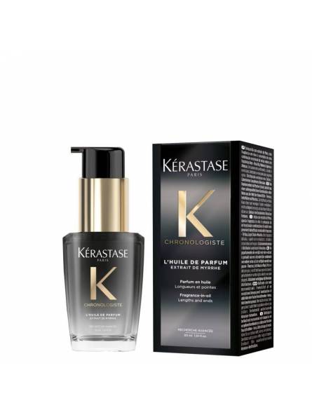 Con una infusión de extracto de mirra, Kérastase Chronologiste L'Huile de Parfum es una fragancia en aceite para el cabello compuesta por una combinación excepcional de notas nobles del mundo de las fragancias finas: Rosa de Té, Maderas Ligeras y Almizcle. Delicadamente perfumado, el cabello se revitaliza, hidrata y engrosa tras unas gotas.