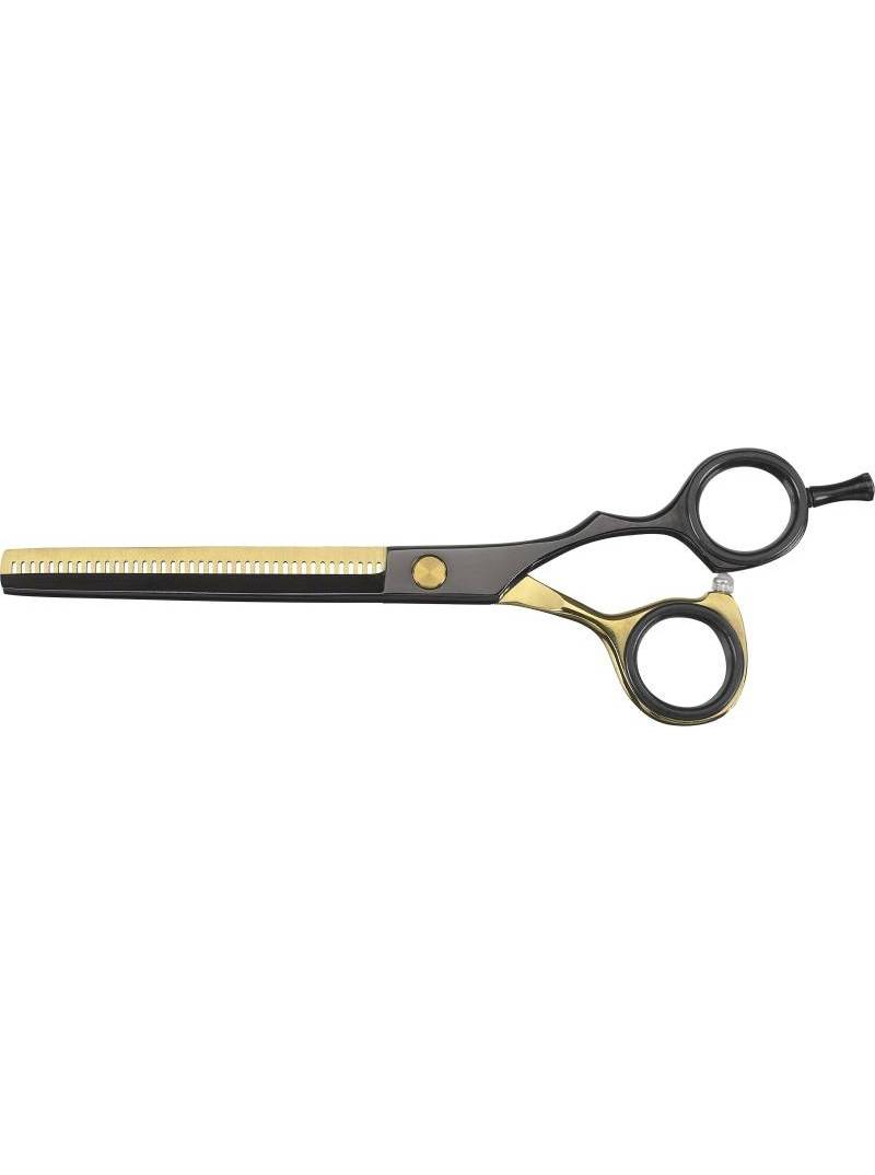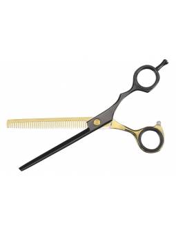 Tijeras de esculpir ergonómica offset en color negro y dorado.