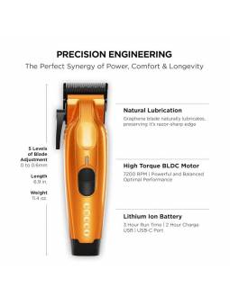 La cortadora de pelo VELOCE PRO cuenta con una carcasa de aleación de aluminio totalmente metálica con tecnología ultraligera, lo que la hace ideal para uso profesional. El diseño especial brinda una mejor visión mientras se corta, lo que ayuda a obtener resultados precisos en todo momento.