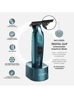 La recortadora Cocco Veloce Pro cuenta con una cuchilla DLC Ambassador de Digital Gap™ de primera clase con un sistema de protección de la piel integrado. La cuchilla DLC Ambassador de Digital Gap™ ofrece un rendimiento superior con un revestimiento táctil.