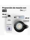 En un bol, biberón o en un mezclador: - Mezclar 60 ml (1 tubo) de crema colorante Dia light. - Después añadir 90ml de Diactivateur 6 vol. (1.8%), 9 vol. (2.7%) o 15 vol. (4.5%) de acuerdo con el resultado deseado. Las cantidades de producto pueden incrementarse o reducirse si es necesario respetando el ratio de mezcla 1:1,5.