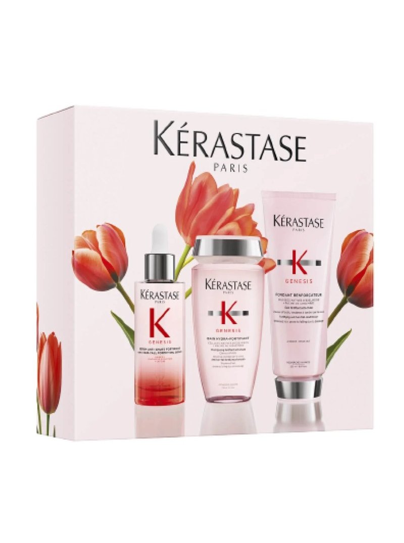 Kérastase cofre Trio Spring Set Genesis 2026 de Edición limitada compuesto por Bain Hydra-Fortifiant, Fondant Renforçateur y Sérum Anti-Chute Fortifiant para el cuidado integral del cabello debilitado con tendencia a la caída.