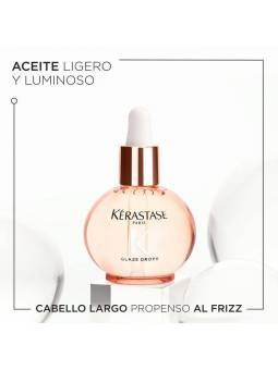 Glaze Drops de Kerastase es un aceite capilar ligero para cabello largo con tendencia al encrespamiento, que busca suavidad y brillo intenso. Está especialmente formulado con extracto de rosa silvestre para un cabello glossy: suave, con brillo y ligero.