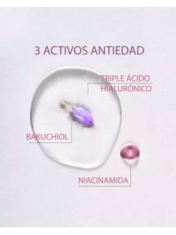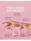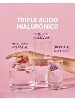 Entre sus activos principales se encuentra el Ácido Hialurónico en tres diferentes pesos moleculares. El ácido hialurónico de alto peso molecular consigue hidratar y reparar la piel dejándola suave y tersa. El ácido hialurónico de medio peso molecular ayuda a mantener la piel hidratada desde dentro. El ácido hialurónico de bajo peso molecular consigue penetrar en mayor profundidad hidratando y ofreciendo un efecto rellenador de arrugas, dejando la piel más firme y elástica.