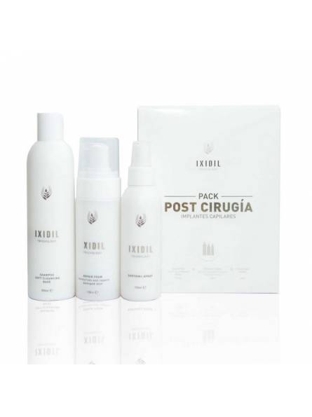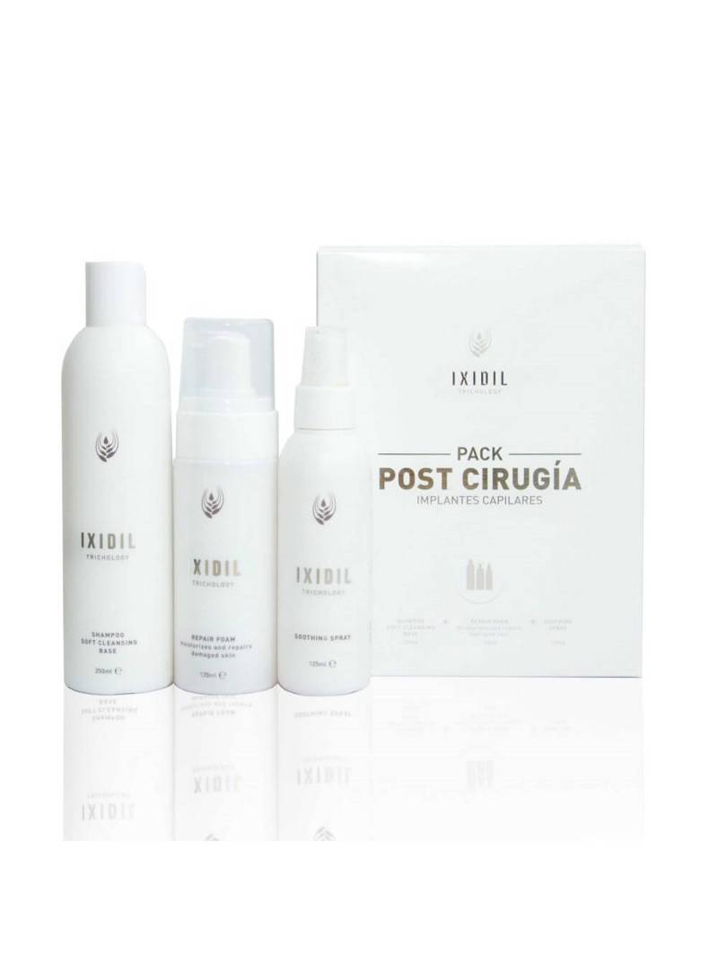 Incluye tres productos: CHAMPÚ ULTRA HIDRATANTE IXIDIL, un shampoo sin alérgenos ni parabenos, de base neutra con pH 5,5 TÓNICO HIDRO CALMANTE IXIDIL que calma e hidrata el cuero cabelludo, con aloe vera y extracto de manzanilla con efectos antiinflamatorios. ESPUMA HIDRATANTE DESINFECTANTE IXIDIL, espuma con agentes bactericidas que nutre y protege los folículos durante los primeros días después de la cirugía, a la vez que hidrata las costras y favorece que se caigan de forma suave y segura.