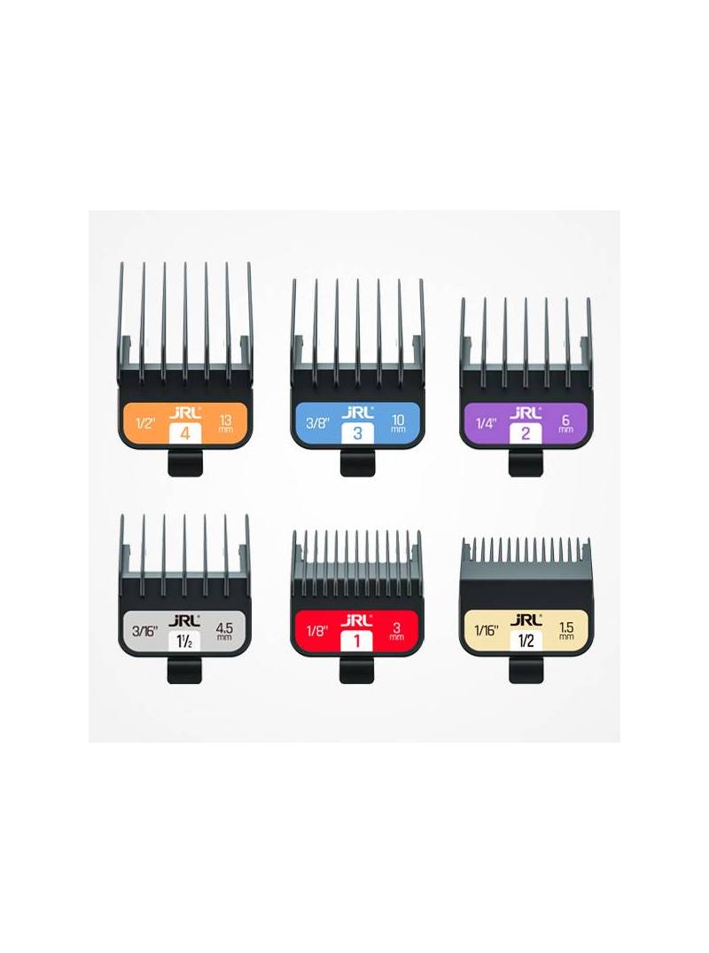 Peines guía de recambio. Su clip doble de metal imantado sujeta de manera segura los peines, aportando tranquilidad y seguridad a la hora del trabajo. Desarrollados con un plástico muy resistente, que se desliza a la perfección en el cabello para un corte más suave. Sus dientes redondeados proporcionan una experiencia de corte más agradable. Pack de 6 uds.