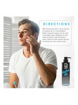 Humedezca su piel y aplique una pequeña cantidad de gel de afeitar en las yemas de los dedos o directamente en el área a afeitar. Masajee o frote suavemente el gel de afeitar para distribuirlo uniformemente y comience a afeitarse en la dirección en que crece el cabello. Finalmente, enjuague con agua.