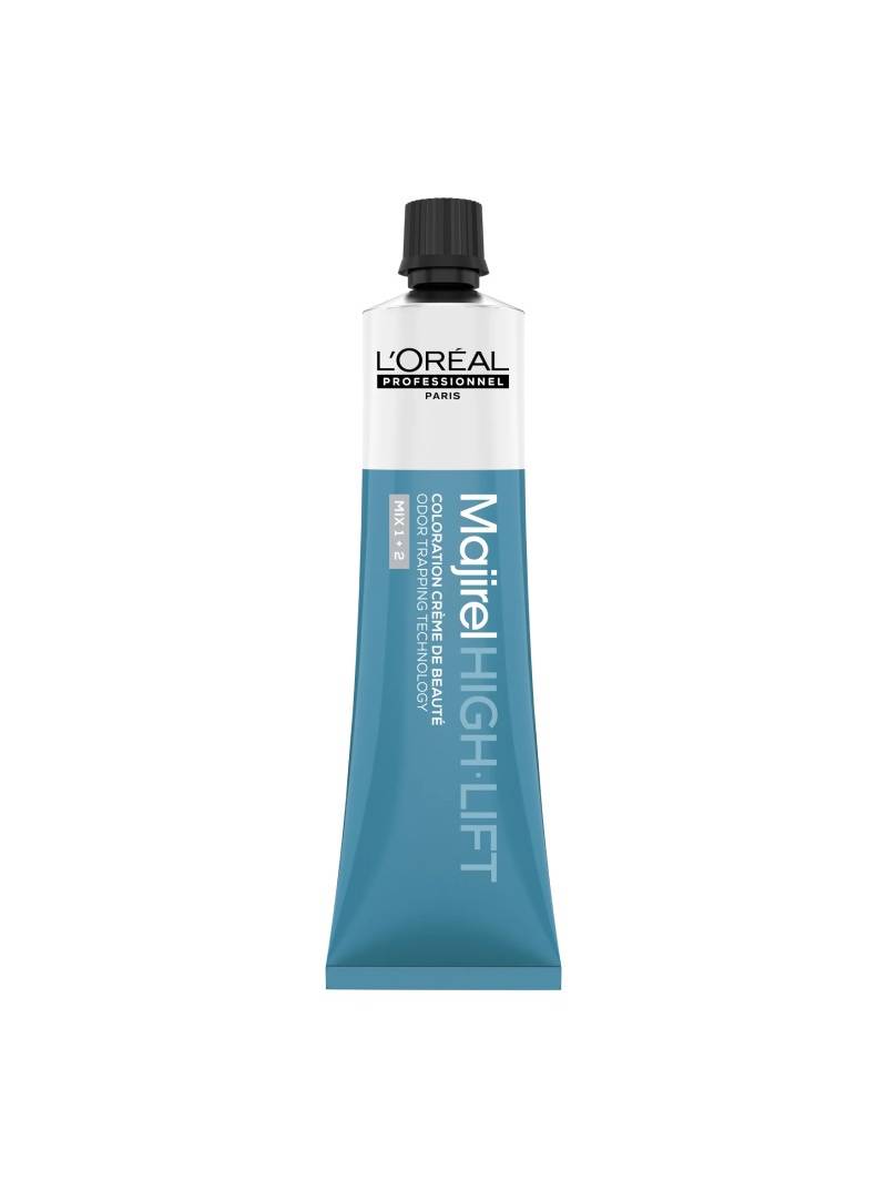 Majirel High Lift se usa en una mezcla (MEZCLA 1 + 2). Un tubo de 60ml se mezcla con 120ml de oxidante L’Oréal Professionnel de 30 volúmenes (9%) para aclarar hasta 3 niveles.