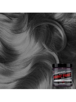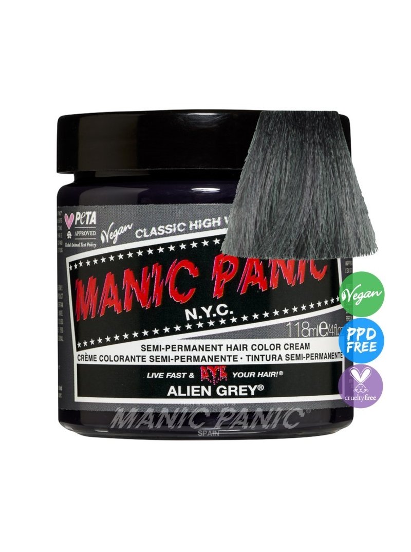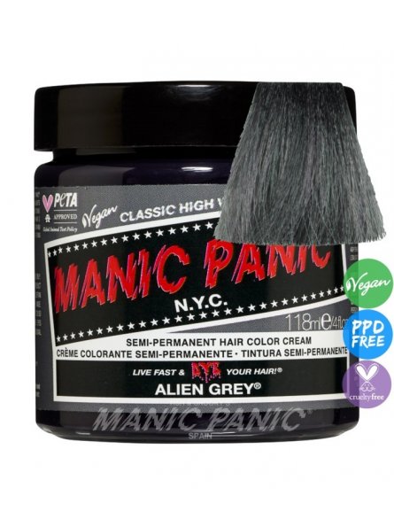 Tinte fantasía semipermanente vegano para el pelo Manic Panic High Voltage CLASSIC, color gris pizarra ALIEN GREY, formulado con ingredientes naturales de alta calidad y la mejor selección de pigmentos, sin amoniaco y libre de gluten, ftalatos, resorcinol y de PPD. Aplicación directa sin peróxido sobre cabello seco. Contiene 118 ml. Este tono requiere ser aplicado sobre base extraclara bien matizada (nº 10).