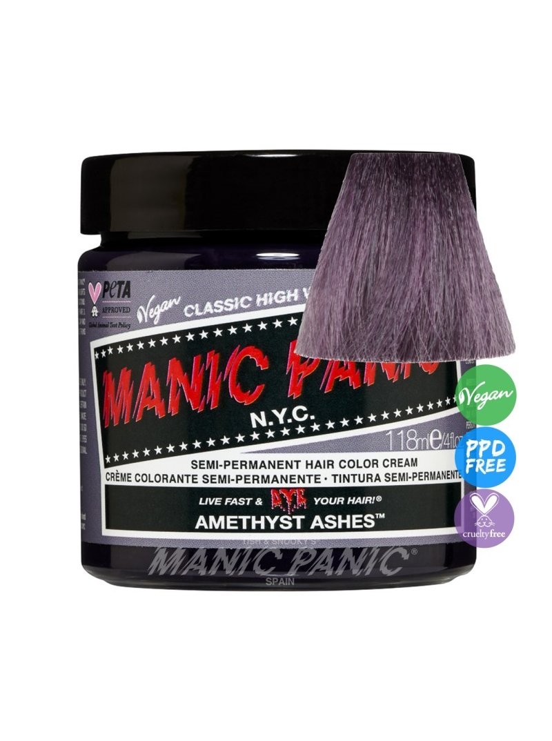 Tinte fantasía semipermanente vegano para el pelo Manic Panic High Voltage CLASSIC, color gris malva AMETHSYT ASHES, formulado con ingredientes naturales de alta calidad y la mejor selección de pigmentos, sin amoniaco y libre de gluten, ftalatos, resorcinol y de PPD. Aplicación directa sin peróxido sobre cabello seco. Contiene 118 ml. Este tono requiere ser aplicado sobre base extraclara bien matizada (nº 10).