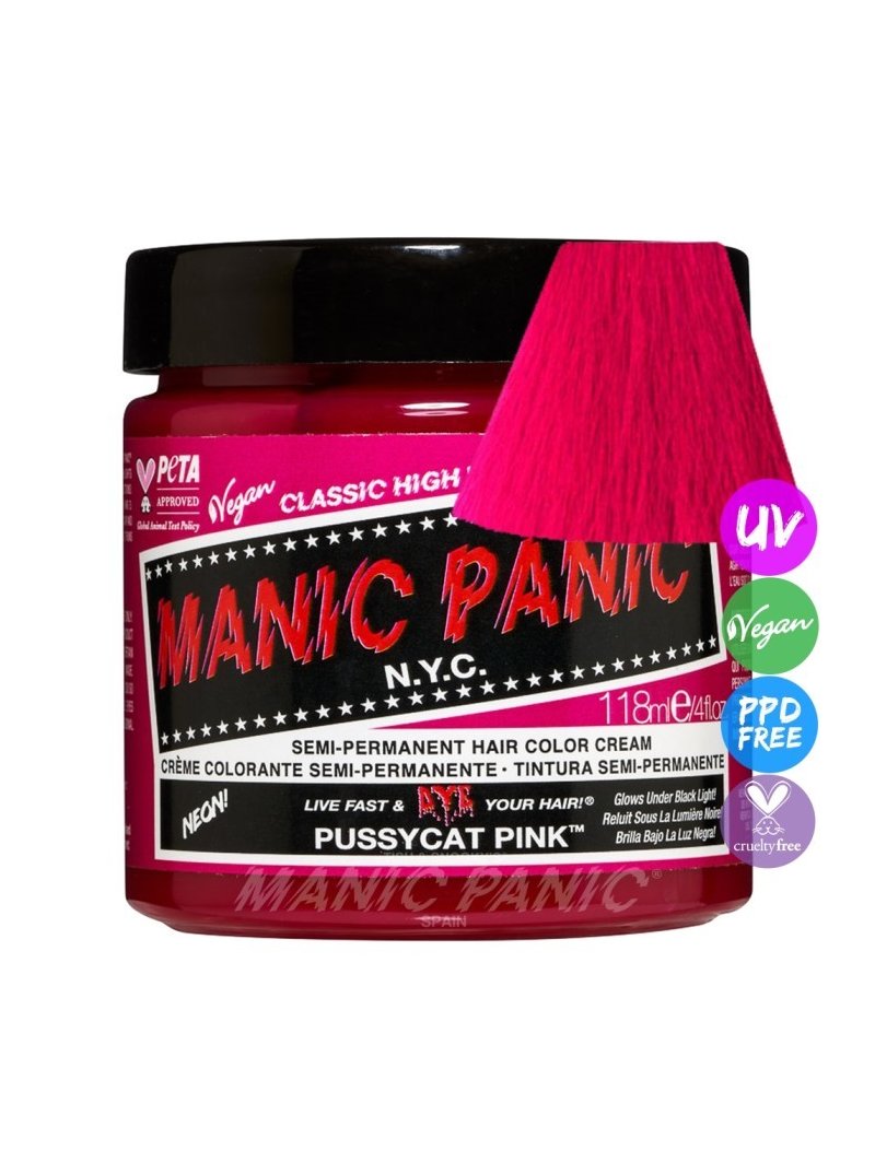 Tinte fantasía semipermanente vegano para el pelo Manic Panic High Voltage CLASSIC, color rosa eléctrico PUSSYCAT PINK, formulado con ingredientes naturales de alta calidad y la mejor selección de pigmentos, sin amoniaco y libre de gluten, ftalatos, resorcinol y de PPD. Aplicación directa sin peróxido sobre cabello seco. Contiene 118 ml. Tinte fantasía con efecto neón: brilla bajo las luces negras o ultravioletas.