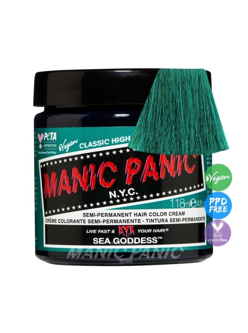 Tinte fantasía semipermanente vegano para el pelo Manic Panic High Voltage CLASSIC, color verde agua oscuro SEA GODDESS, formulado con ingredientes naturales de alta calidad y la mejor selección de pigmentos, sin amoniaco y libre de gluten, ftalatos, resorcinol y de PPD. Aplicación directa sin peróxido sobre cabello seco. Contiene 118 ml.