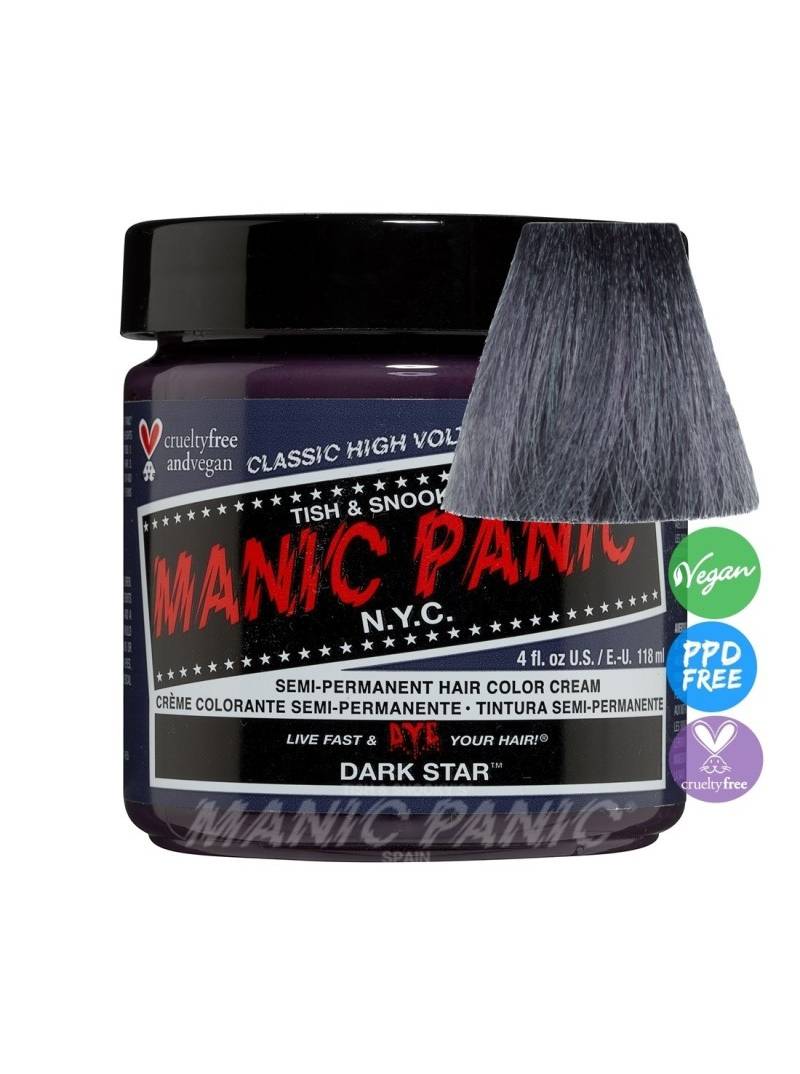 Tinte fantasía semipermanente para el pelo Manic Panic High Voltage CLASSIC, color gris violáceo DARK STAR, formulado a base de pigmentos naturales veganos de alta calidad, sin amoniaco y libre de parabenos, gluten y de PPD. Aplicación directa sin peróxido sobre cabello seco. Contiene 118 ml. Este tono requiere ser aplicado sobre base extraclara bien matizada (nº 10).