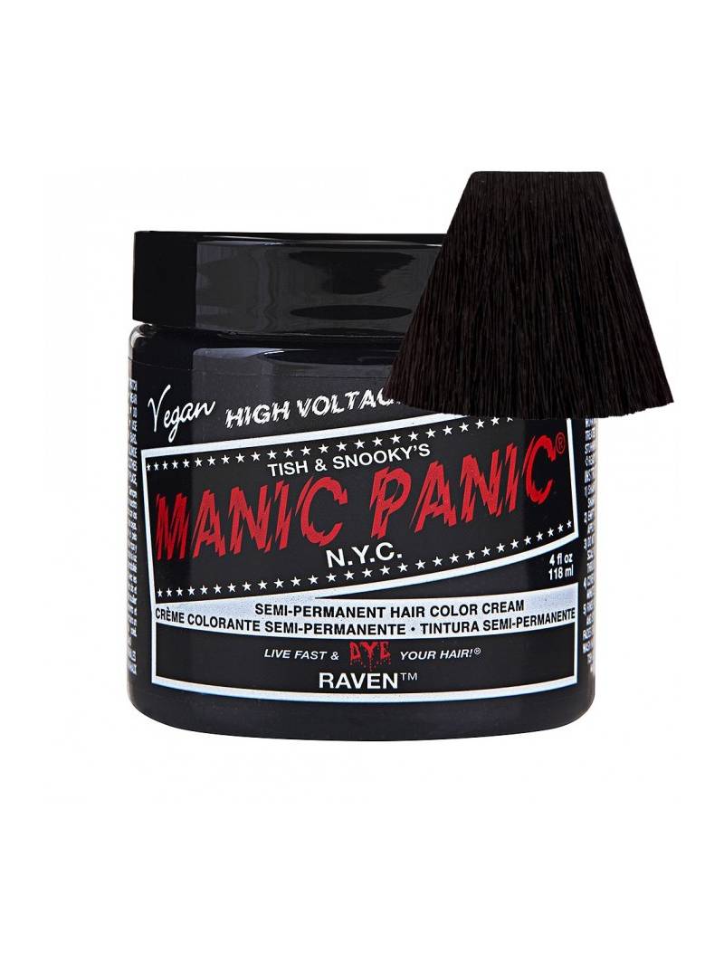 Tinte fantasía semipermanente para el pelo Manic Panic High Voltage CLASSIC, color negro RAVEN, formulado a base de pigmentos naturales veganos de alta calidad, sin amoniaco y libre de parabenos, gluten y de PPD. Aplicación directa sin peróxido sobre cabello seco. Contiene 118 ml. Destaca por su acabado perfecto, ya que al mismo tiempo que colorea con gran viveza e intensidad, funciona de acondicionador, nutriendo y reparando tu cabello e intensificando su brillo natural. Puedes mezclarlo con otros tintes Manic Panic (Classic o Amplified) para crear nuevos y originales colores personalizados o con el Mixer/Pastel-izer para aclarlo o conseguir tonos pasteles.