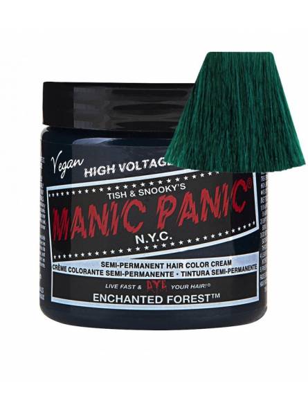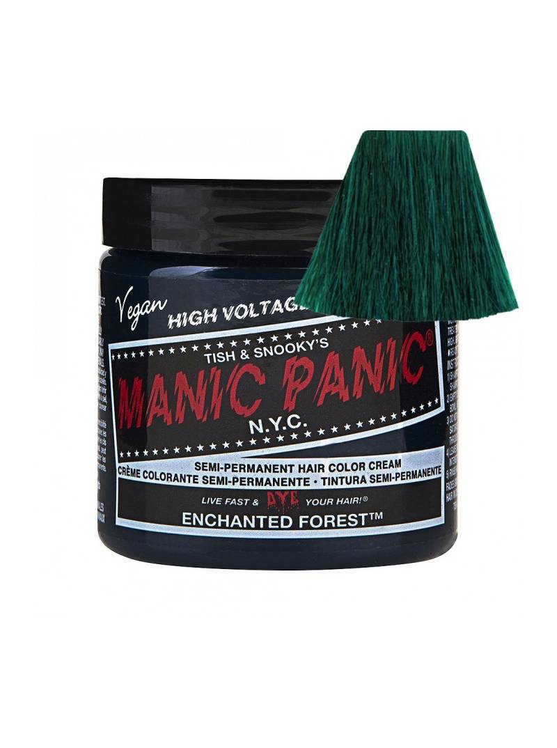 Tinte fantasía semipermanente para el pelo Manic Panic High Voltage CLASSIC, color verde ENCHANTED FOREST, formulado a base de pigmentos naturales veganos de alta calidad, sin amoniaco y libre de parabenos, gluten y de PPD. Aplicación directa sin peróxido sobre cabello seco. Contiene 118 ml. Destaca por su acabado perfecto, ya que al mismo tiempo que colorea con gran viveza e intensidad, funciona de acondicionador, nutriendo y reparando tu cabello e intensificando su brillo natural. Puedes mezclarlo con otros tintes Manic Panic (Classic o Amplified) para crear nuevos y originales colores personalizados o con el Mixer/Pastel-izer para aclarlo o conseguir tonos pasteles.