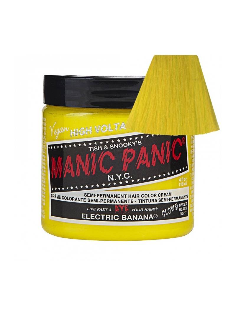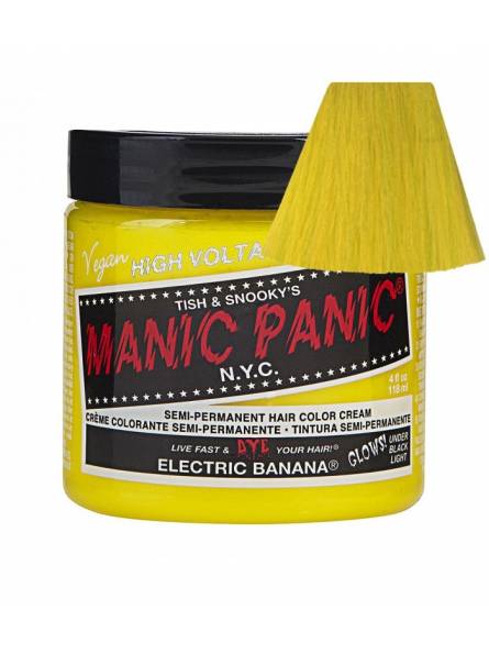 Tinte fantasía semipermanente para el pelo Manic Panic High Voltage CLASSIC, color amarillo fluorescente ELECTRIC BANANA, formulado a base de pigmentos naturales veganos de alta calidad, sin amoniaco y libre de parabenos, gluten y de PPD. Aplicación directa sin peróxido sobre cabello seco. Contiene 118 ml. Tinte fantasía con efecto neón: brilla bajo las luces negras o ultravioletas. Destaca por su acabado perfecto, ya que al mismo tiempo que colorea con gran viveza e intensidad, funciona de acondicionador, nutriendo y reparando tu cabello e intensificando su brillo natural. Puedes mezclarlo con otros tintes Manic Panic (Classic o Amplified) para crear nuevos y originales colores personalizados o con el Mixer/Pastel-izer para aclarlo o conseguir tonos pasteles.