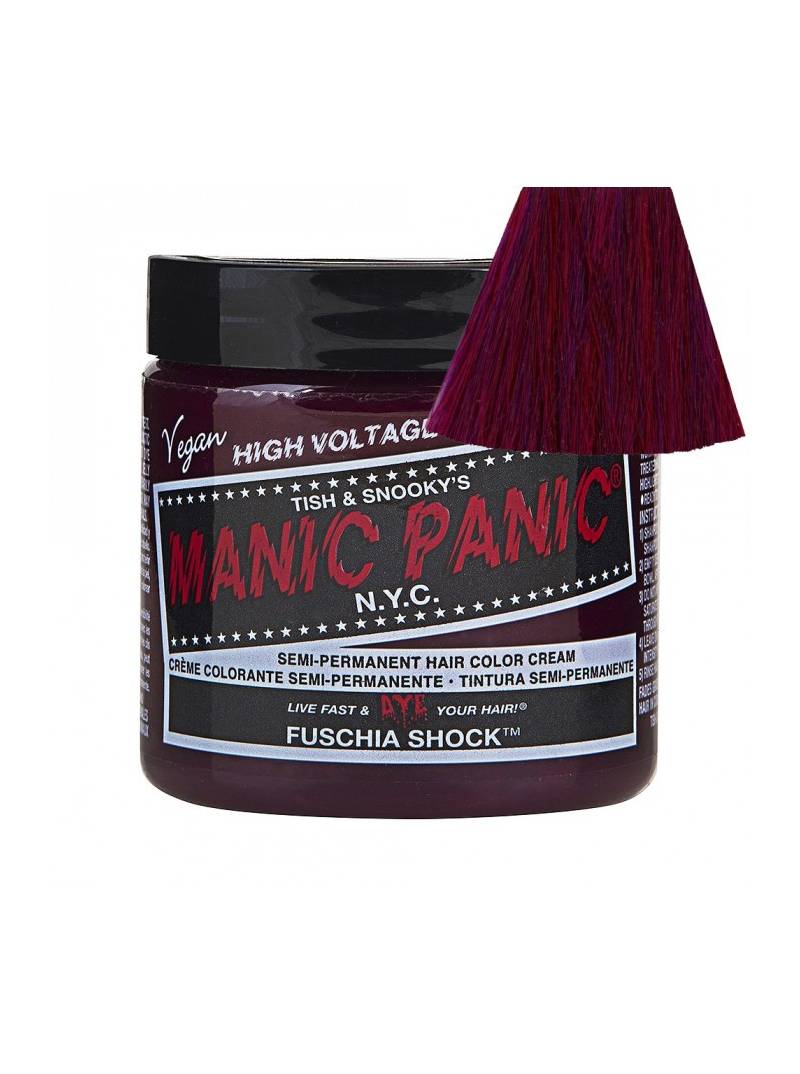 Tinte fantasía semipermanente para el pelo Manic Panic High Voltage CLASSIC, color rosa fucsia FUSCHIA SHOCK, formulado a base de pigmentos naturales veganos de alta calidad, sin amoniaco y libre de parabenos, gluten y de PPD. Aplicación directa sin peróxido sobre cabello seco. Contiene 118 ml. Destaca por su acabado perfecto, ya que al mismo tiempo que colorea con gran viveza e intensidad, funciona de acondicionador, nutriendo y reparando tu cabello e intensificando su brillo natural. Puedes mezclarlo con otros tintes Manic Panic (Classic o Amplified) para crear nuevos y originales colores personalizados o con el Mixer/Pastel-izer para aclarlo o conseguir tonos pasteles.