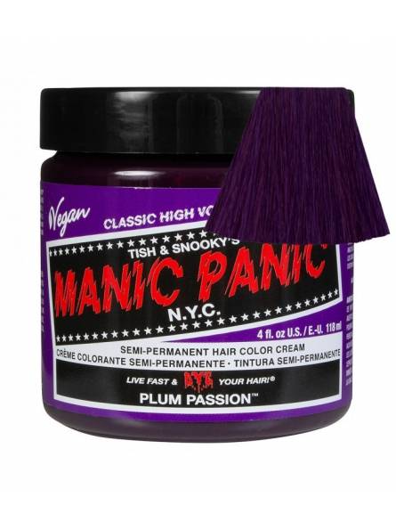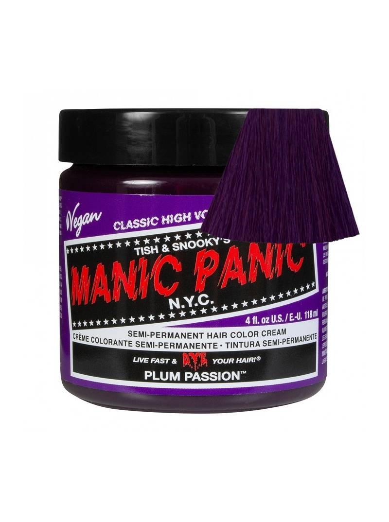 Tinte fantasía semipermanente para el pelo Manic Panic High Voltage CLASSIC, color morado PLUM PASSION, formulado a base de pigmentos naturales veganos de alta calidad, sin amoniaco y libre de parabenos, gluten y de PPD. Aplicación directa sin peróxido sobre cabello seco. Contiene 118 ml. Destaca por su acabado perfecto, ya que al mismo tiempo que colorea con gran viveza e intensidad, funciona de acondicionador, nutriendo y reparando tu cabello e intensificando su brillo natural. Puedes mezclarlo con otros tintes Manic Panic (Classic o Amplified) para crear nuevos y originales colores personalizados o con el Mixer/Pastel-izer para aclarlo o conseguir tonos pasteles.