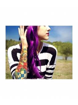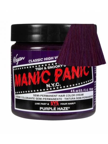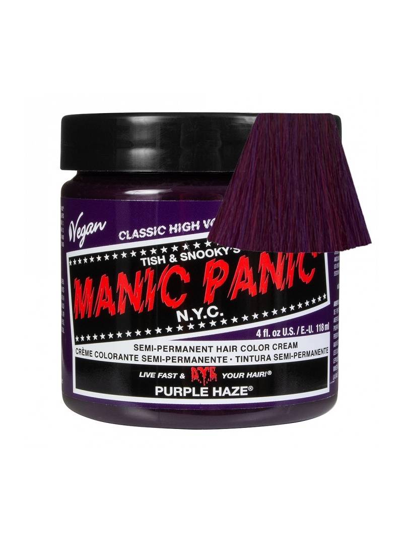 Tinte fantasía semipermanente para el pelo Manic Panic High Voltage CLASSIC, color morado púrpura PURPLE HAZE, formulado a base de pigmentos naturales veganos de alta calidad, sin amoniaco y libre de parabenos, gluten y de PPD. Aplicación directa sin peróxido sobre cabello seco. Contiene 118 ml. Destaca por su acabado perfecto, ya que al mismo tiempo que colorea con gran viveza e intensidad, funciona de acondicionador, nutriendo y reparando tu cabello e intensificando su brillo natural. Puedes mezclarlo con otros tintes Manic Panic (Classic o Amplified) para crear nuevos y originales colores personalizados o con el Mixer/Pastel-izer para aclarlo o conseguir tonos pasteles.