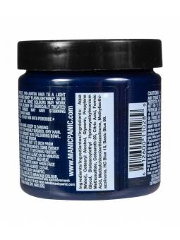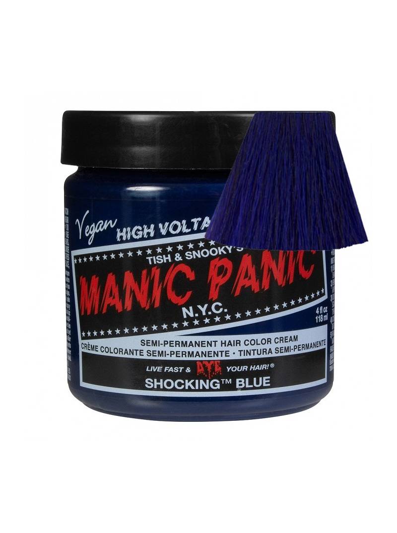 Tinte fantasía semipermanente para el pelo Manic Panic High Voltage CLASSIC, color azul añil SHOCKING BLUE, formulado a base de pigmentos naturales veganos de alta calidad, sin amoniaco y libre de parabenos, gluten y de PPD. Aplicación directa sin peróxido sobre cabello seco. Contiene 118 ml. Destaca por su acabado perfecto, ya que al mismo tiempo que colorea con gran viveza e intensidad, funciona de acondicionador, nutriendo y reparando tu cabello e intensificando su brillo natural. Puedes mezclarlo con otros tintes Manic Panic (Classic o Amplified) para crear nuevos y originales colores personalizados o con el Mixer/Pastel-izer para aclarlo o conseguir tonos pasteles.