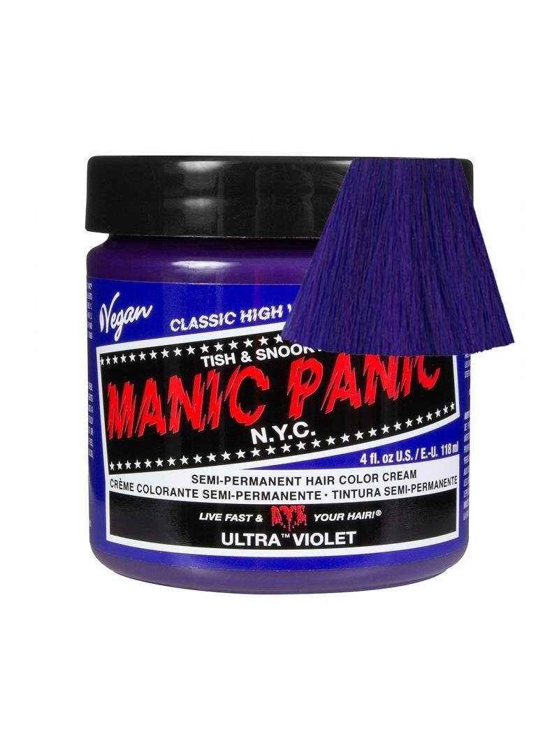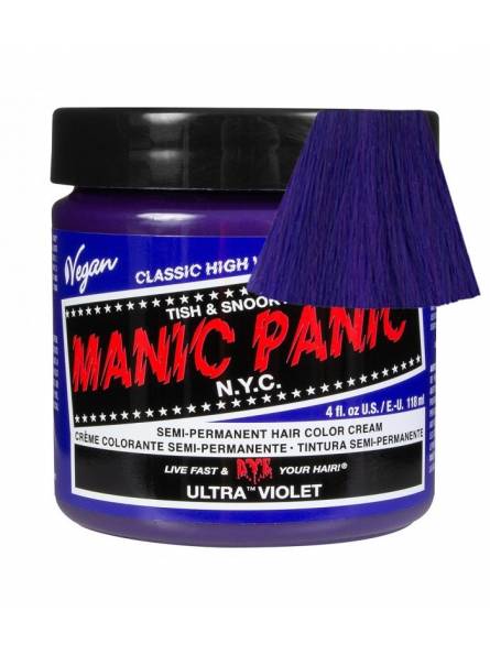 Tinte fantasía semipermanente para el pelo Manic Panic High Voltage CLASSIC, color azul violeta ULTRA VIOLET, formulado a base de pigmentos naturales veganos de alta calidad, sin amoniaco y libre de parabenos, gluten y de PPD. Aplicación directa sin peróxido sobre cabello seco. Contiene 118 ml. Este tono requiere ser aplicado sobre base extraclara bien matizada. Destaca por su acabado perfecto, ya que al mismo tiempo que colorea con gran viveza e intensidad, funciona de acondicionador, nutriendo y reparando tu cabello e intensificando su brillo natural. Puedes mezclarlo con otros tintes Manic Panic (Classic o Amplified) para crear nuevos y originales colores personalizados o con el Mixer/Pastel-izer para aclarlo o conseguir tonos pasteles.