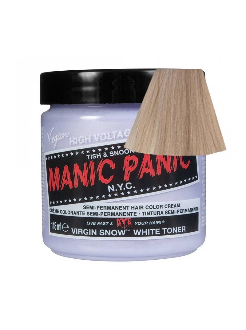 Tóner semipermanente (corrector del color) para el pelo Manic Panic High Voltage CLASSIC, color VIRGIN SNOW, formulado a base de pigmentos naturales veganos de alta calidad, sin amoniaco y libre de parabenos, gluten y de PPD. Aplicación directa sin peróxido sobre cabello seco. Contiene 118 ml. Destaca por su acabado perfecto, ya que al mismo tiempo que actúa corrigiendo el subtono dorado, funciona como acondicionador, nutriendo y reparando tu cabello e intensificando su brillo natural