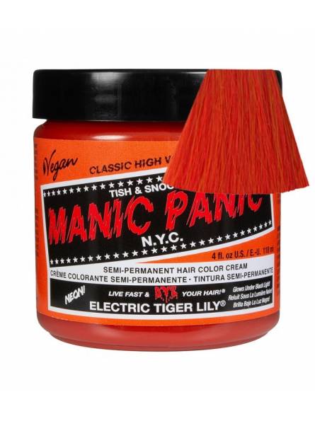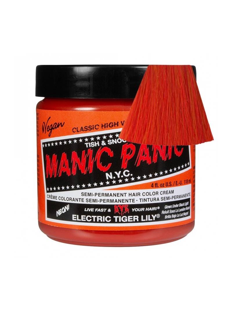 Tinte fantasía semipermanente para el pelo Manic Panic High Voltage CLASSIC, color naranja ELECTRIC TIGER LILY, formulado a base de pigmentos naturales veganos de alta calidad, sin amoniaco y libre de parabenos, gluten y de PPD. Aplicación directa sin peróxido sobre cabello seco. Contiene 118 ml. Destaca por su acabado perfecto, ya que al mismo tiempo que colorea con gran viveza e intensidad, funciona de acondicionador, nutriendo y reparando tu cabello e intensificando su brillo natural. Puedes mezclarlo con otros tintes Manic Panic (Classic o Amplified) para crear nuevos y originales colores personalizados o con el Mixer/Pastel-izer para aclarlo o conseguir tonos pasteles.