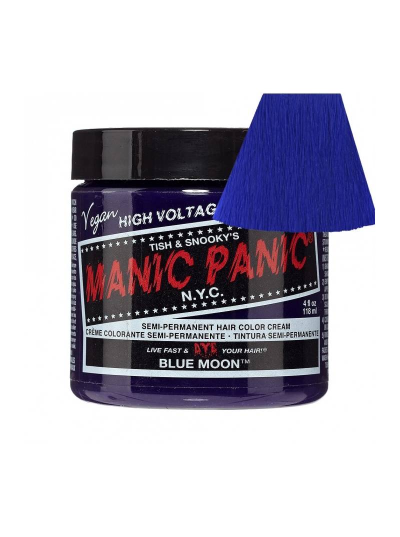 Tinte fantasía semipermanente para el pelo Manic Panic High Voltage CLASSIC, color azul intenso BLUE MOON, formulado a base de pigmentos naturales veganos de alta calidad, sin amoniaco y libre de parabenos, gluten y de PPD. Aplicación directa sin peróxido sobre cabello seco. Contiene 118 ml. Destaca por su acabado perfecto, ya que al mismo tiempo que colorea con gran viveza e intensidad, funciona de acondicionador, nutriendo y reparando tu cabello e intensificando su brillo natural. Puedes mezclarlo con otros tintes Manic Panic (Classic o Amplified) para crear nuevos y originales colores personalizados o con el Mixer/Pastel-izer para aclarlo o conseguir tonos pasteles.