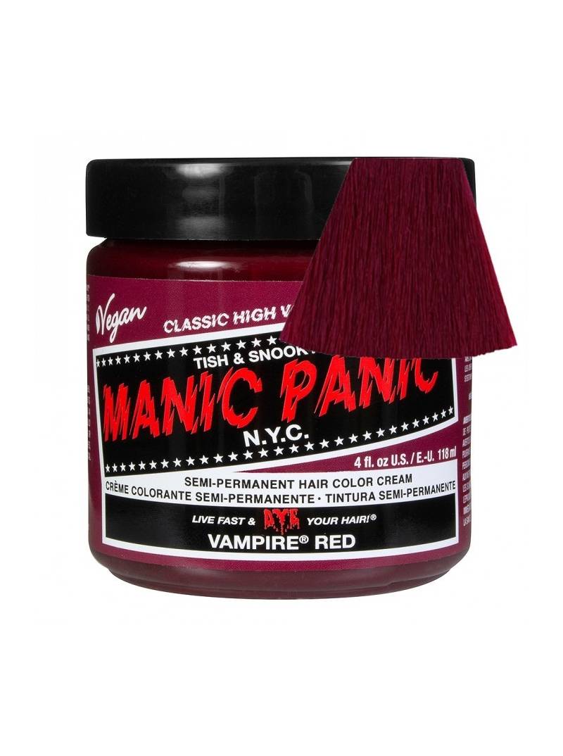 Tinte fantasía semipermanente para el pelo Manic Panic High Voltage CLASSIC, color rojo sangre VAMPIRE RED, formulado a base de pigmentos naturales veganos de alta calidad, sin amoniaco y libre de parabenos, gluten y de PPD. Aplicación directa sin peróxido sobre cabello seco. Contiene 118 ml.