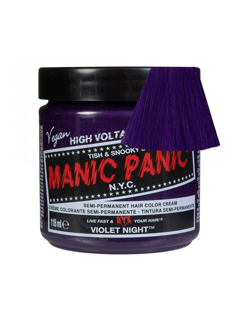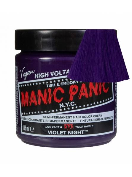 Tinte fantasía semipermanente para el pelo Manic Panic High Voltage CLASSIC, color violeta VIOLET NIGHT, formulado a base de pigmentos naturales veganos de alta calidad, sin amoniaco y libre de parabenos, gluten y de PPD. Aplicación directa sin peróxido sobre cabello seco. Contiene 118 ml. Destaca por su acabado perfecto, ya que al mismo tiempo que colorea con gran viveza e intensidad, funciona de acondicionador, nutriendo y reparando tu cabello e intensificando su brillo natural. Puedes mezclarlo con otros tintes Manic Panic (Classic o Amplified) para crear nuevos y originales colores personalizados o con el Mixer/Pastel-izer para aclarlo o conseguir tonos pasteles.