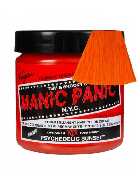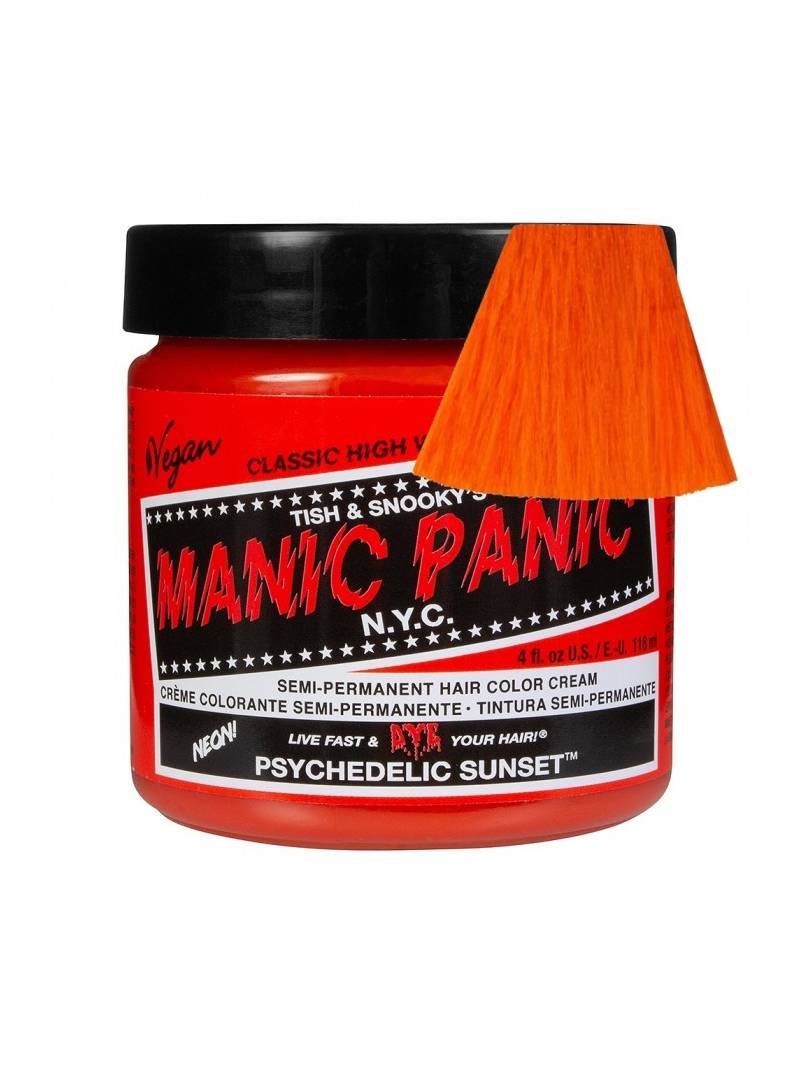 Tinte fantasía semipermanente para el pelo Manic Panic High Voltage CLASSIC, color naranja fuego PSYCHEDELIC SUNSET, formulado a base de pigmentos naturales veganos de alta calidad, sin amoniaco y libre de parabenos, gluten y de PPD. Aplicación directa sin peróxido sobre cabello seco. Contiene 118 ml. Destaca por su acabado perfecto, ya que al mismo tiempo que colorea con gran viveza e intensidad, funciona de acondicionador, nutriendo y reparando tu cabello e intensificando su brillo natural. Puedes mezclarlo con otros tintes Manic Panic (Classic o Amplified) para crear nuevos y originales colores personalizados o con el Mixer/Pastel-izer para aclarlo o conseguir tonos pasteles.