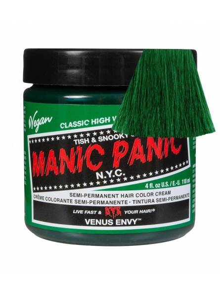 Tinte fantasía semipermanente para el pelo Manic Panic High Voltage CLASSIC, color verde VENUS ENVY, formulado a base de pigmentos naturales veganos de alta calidad, sin amoniaco y libre de parabenos, gluten y de PPD. Aplicación directa sin peróxido sobre cabello seco. Contiene 118 ml. Destaca por su acabado perfecto, ya que al mismo tiempo que colorea con gran viveza e intensidad, funciona de acondicionador, nutriendo y reparando tu cabello e intensificando su brillo natural. Puedes mezclarlo con otros tintes Manic Panic (Classic o Amplified) para crear nuevos y originales colores personalizados o con el Mixer/Pastel-izer para aclarlo o conseguir tonos pasteles.