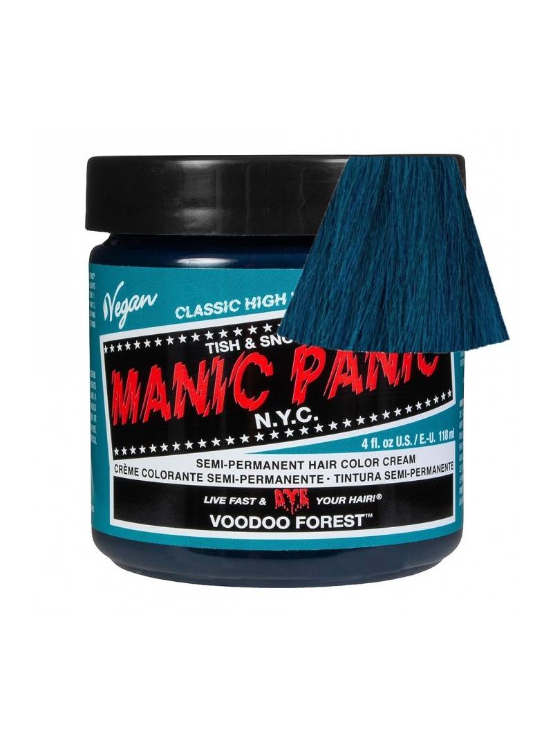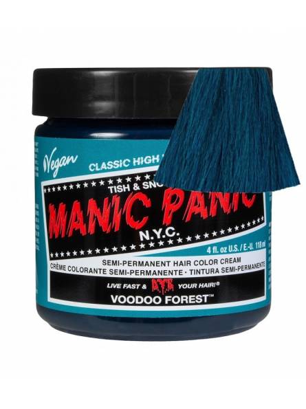 Tinte fantasía semipermanente para el pelo Manic Panic High Voltage CLASSIC, color azul turquesa oscuro VOODOO FOREST, formulado a base de pigmentos naturales veganos de alta calidad, sin amoniaco y libre de parabenos, gluten y de PPD. Aplicación directa sin peróxido sobre cabello seco. Contiene 118 ml. Destaca por su acabado perfecto, ya que al mismo tiempo que colorea con gran viveza e intensidad, funciona de acondicionador, nutriendo y reparando tu cabello e intensificando su brillo natural. Puedes mezclarlo con otros tintes Manic Panic (Classic o Amplified) para crear nuevos y originales colores personalizados o con el Mixer/Pastel-izer para aclarlo o conseguir tonos pasteles.