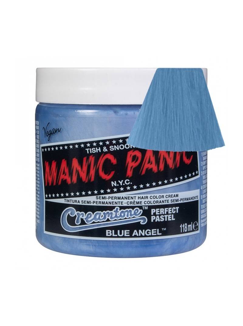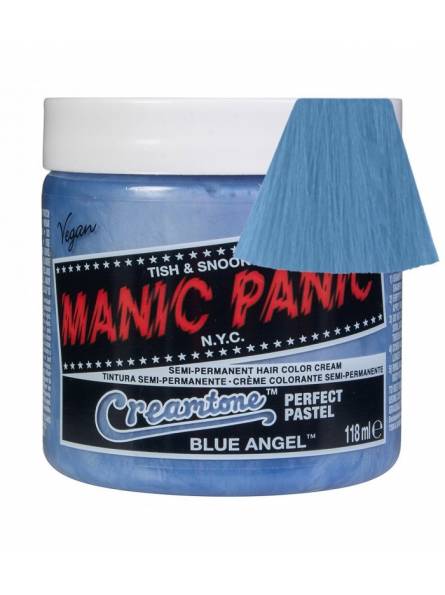 Tinte fantasía semipermanente para el pelo Manic Panic High Voltage CLASSIC CREAMTONE, color azul cielo pastel BLUE ANGEL, formulado a base de pigmentos naturales veganos de alta calidad, sin amoniaco y libre de parabenos, gluten y de PPD. Aplicación directa sin peróxido sobre cabello seco. Contiene 118 ml. Este tono requiere ser aplicado sobre base extraclara bien matizada (nº 10). Destaca por su acabado perfecto, ya que al mismo tiempo que da un toque pastel temporal a tu cabello, funciona de acondicionador.