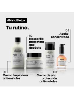 [TECNOLOGÍA] Enriquecido con un 1% de Glicoamina, esta crema sin aclarado de alta protección elimina el metal* del cabello y lo protege de nuevos depósitos de partículas, para evitar la rotura y el cambio de color.