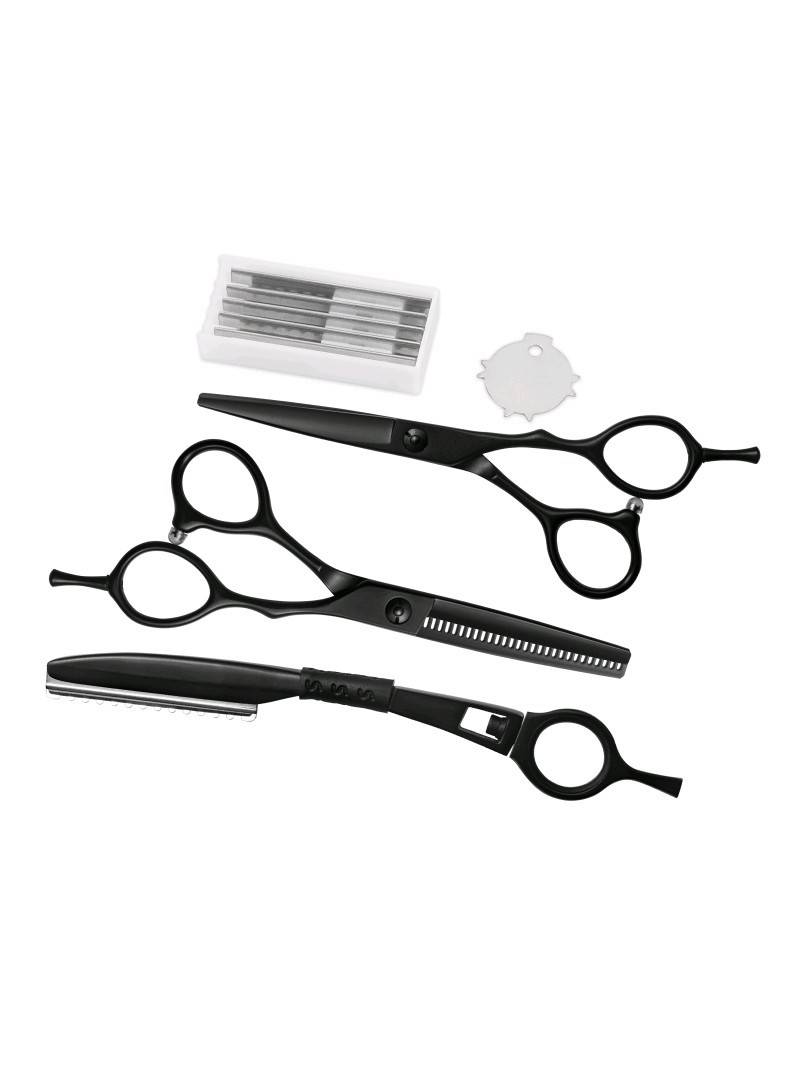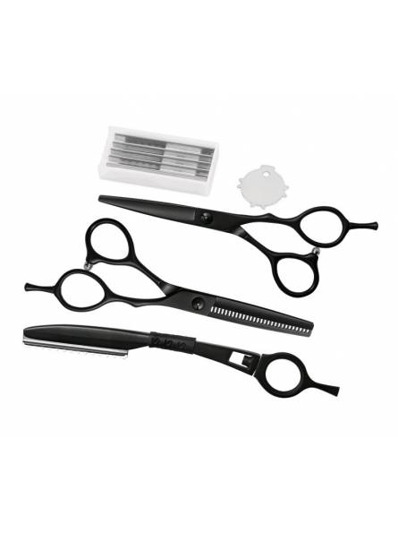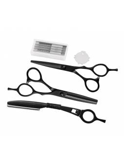 Kit que incluye 1 tijera ergonómica de 5,5 con cuchillas microdentadas y reposadedos extraíble, 1 tijera ergonómica de esculpir de 5,5 con 28 dientes y reposadedos extraíble, 1 navaja con 5 cuchillas de repuesto, llave de tensión. Todo ello dentro de un elegante estuche de piel PU imitación a cocodrilo con cremallera.