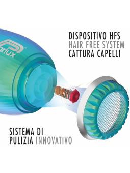 Con un innovador sistema atrapelo HFS "HAIR FREE SYSTEM" que facilita la limpieza del secador y evita posibles averias alargando su vida útil.