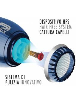 Con un innovador sistema atrapelo HFS "HAIR FREE SYSTEM" que facilita la limpieza del secador y evita posibles averias alargando su vida útil.