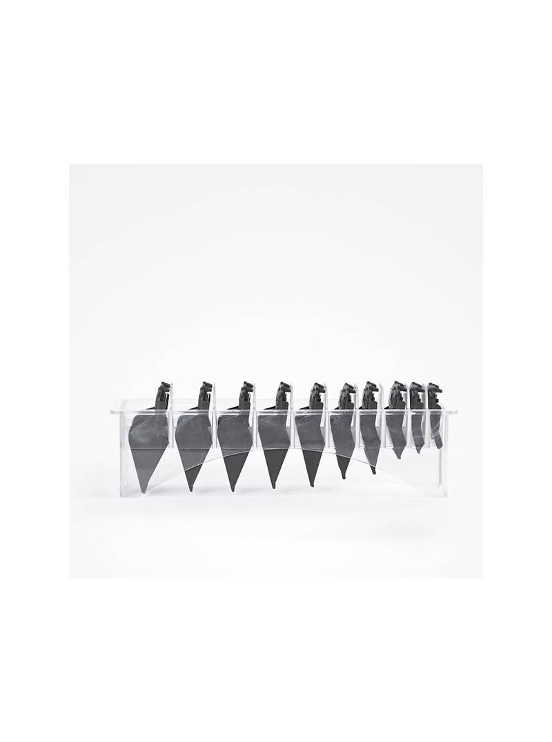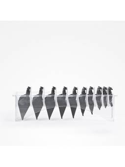 Peines guía de recambio. Su clip de metal imantado sujeta de manera segura los peines, aportando tranquilidad y seguridad a la hora del trabajo. Desarrollados con un plástico muy resistente, relleno de vidrio y minerales, que se desliza a la perfección en el cabello para un corte más suave. Sus dientes redondeados proporcionan una experiencia de corte más agradable a la clientela. Vienen en una bandeja organizadora donde puede almacenarlos sin ocupar apenas espacio.