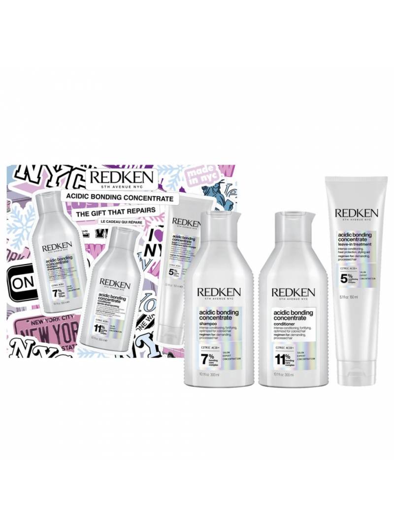 Este cofre de REDKEN contiene el champú, acondicionador y tratamiento sin aclarado Acidic Bonding Concentrate, diseñados para reparar, hidratar y proteger todo tipo de cabello. Formulados con ácido cítrico y tecnología bonding, estos productos reparan los enlaces debilitados del cabello, aportando resistencia, fuerza, hidratación y protección frente al daño capilar.