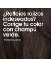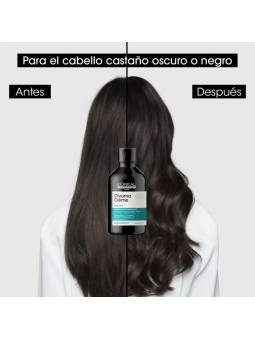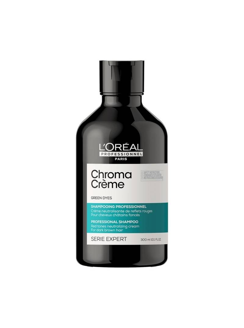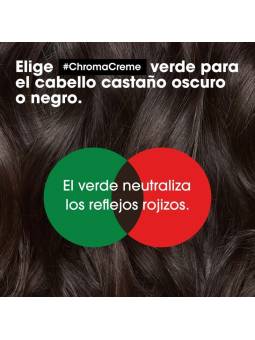 Champú neutralizante de tonos rojizos Chroma Crème. Para cabello castaño oscuro o negro. Con Chroma Crème, corrige & cuida tu color, con un resultado un PRO. Chroma Crème es un trio de cremas neutralizantes de color que ofrecen corrección de color instantánea, a la medida para todos los colores de cabello con un máximo cuidado. El cabello recién coloreado contiene tintes de colores primarios. Después de unas lavadas, estos pigmentos desvanecen y reflejos cálidos amarillos, anaranjados o rojizos aparecen. Existe un mito urbano que dice que el champú morado neutraliza todos los tonos cálidos y mantiene el color. La realidad profesional es otra: el champú morado solo neutraliza los tonos amarillos en el cabello rubio. Por esto, para corregir reflejoscálidos indeseados, debes elegir la corrección de color adecuada. Como el verde neutraliza los reflejos rojizos, elige Chroma Crème verde para los cabellos castaños oscuros o negros. Chroma Crème verde instantáneamente neutraliza todos los reflejos rojizos indeseados, nutre la fibra sin añadir peso, para una corrección de color superior con el máximo cuidado.