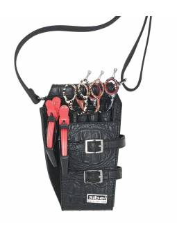 Funda de tijeras para sostener hasta 4 tijeras. También tiene un compartimento adicional para peines u otros equipos. La correa se puede ajustar y quitar.